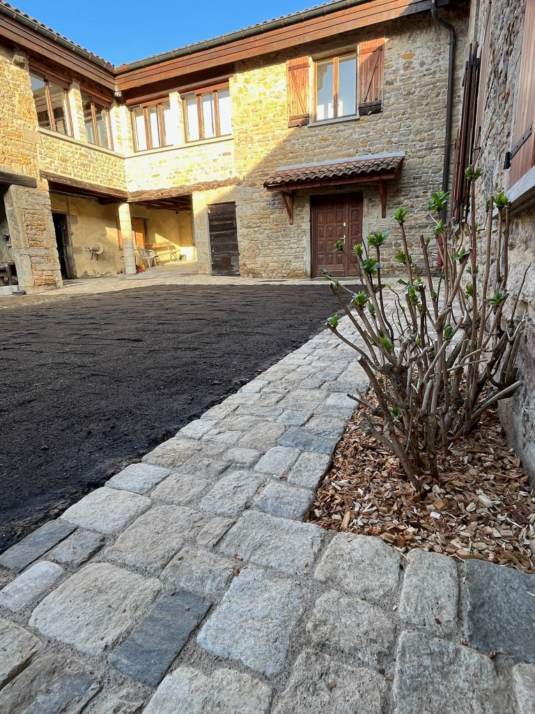 Réalisation d’un pavage en pavés anciens Gaveroche et création d’une zone de gazon.